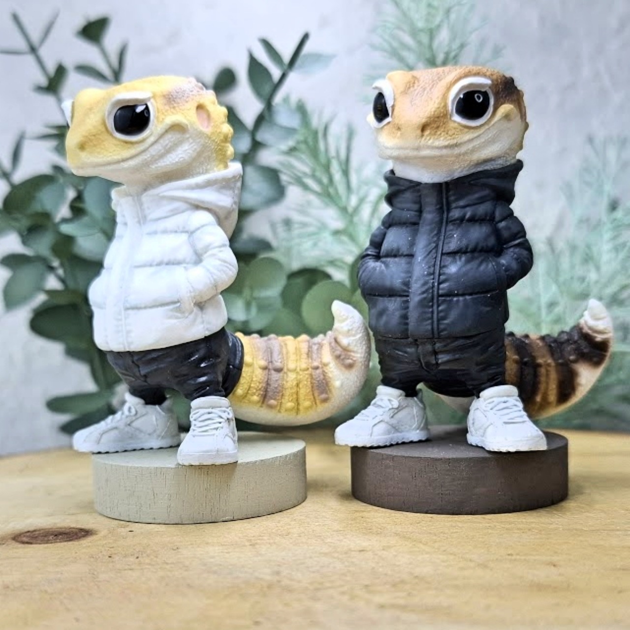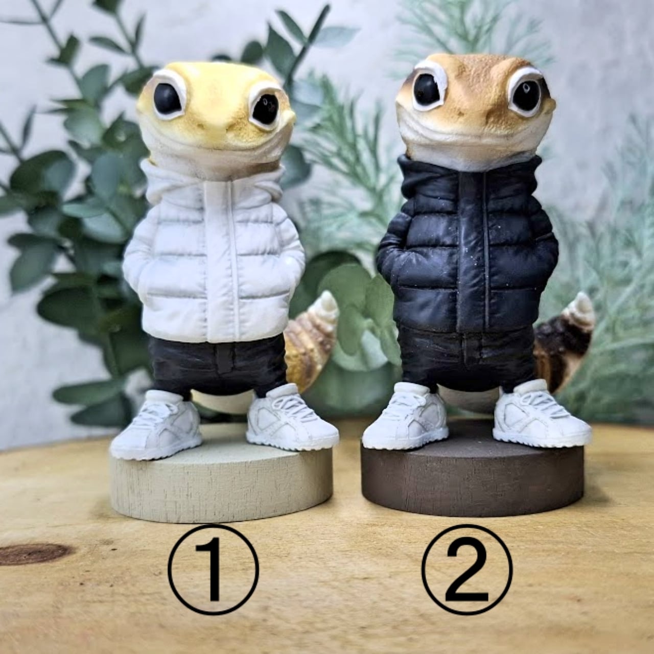 ニシアフリカトカゲモドキのデフォルメフィギュアです。 台座は木製、フィギュアはレジンキャストという合成樹脂でできています。 塗装 :ラッカー塗料、エナメル塗料 サイズ:台座含め高さ約7.5センチ