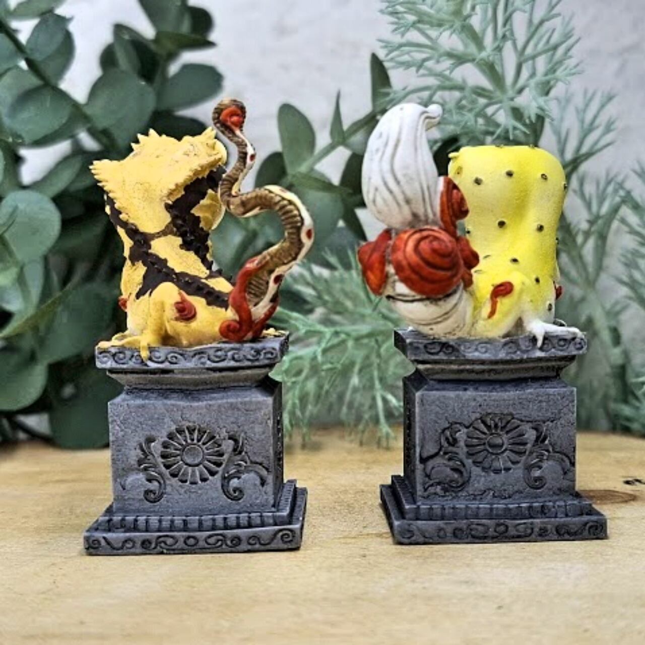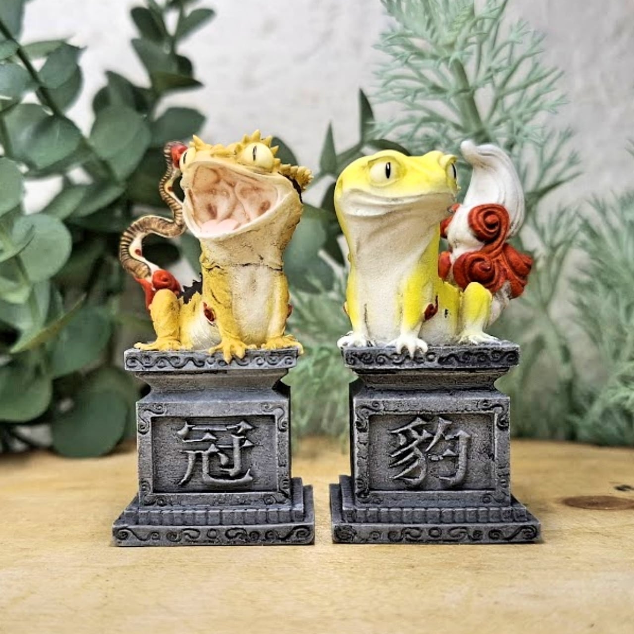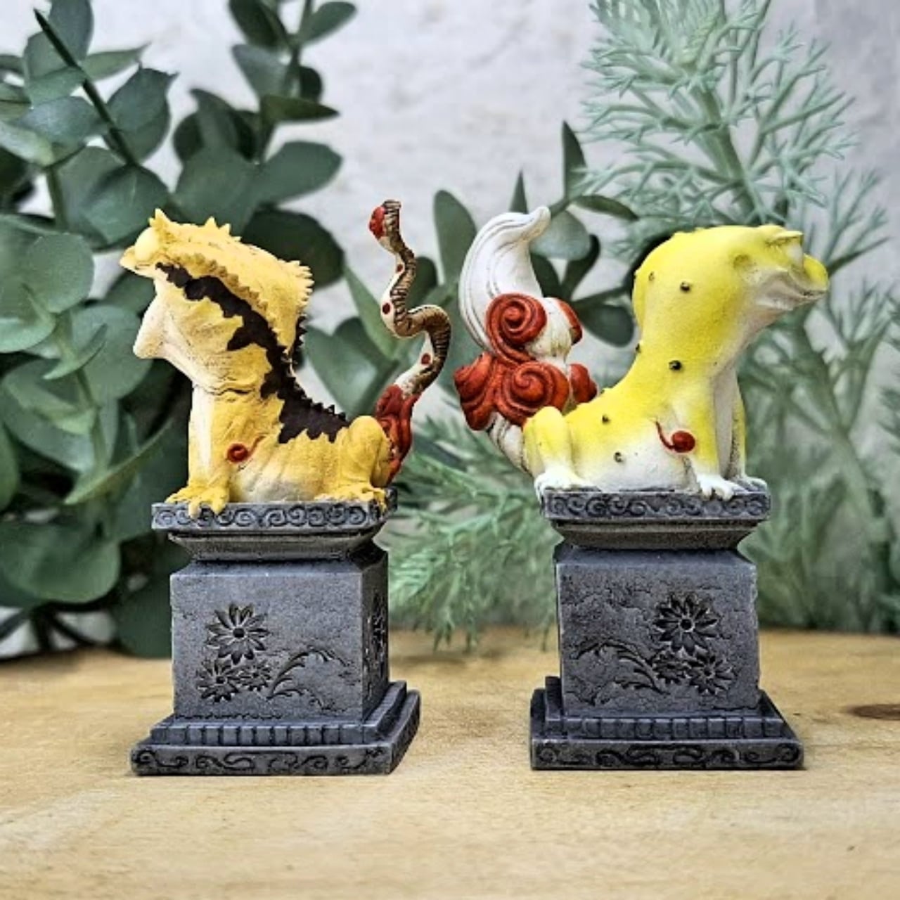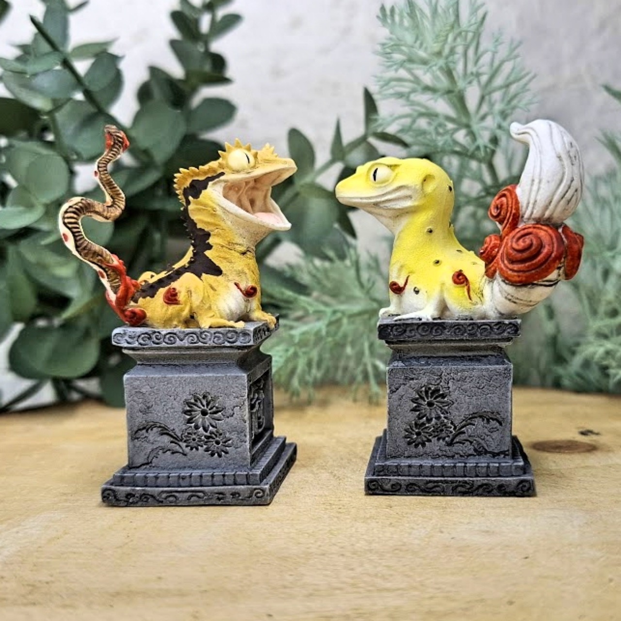 狛犬を爬虫類モチーフにしたシリーズです。 レジンキャストという合成樹脂でできています。 塗装 :ラッカー塗料、エナメル塗料 サイズ:高さ約6センチ 阿吽でセットの価格です。